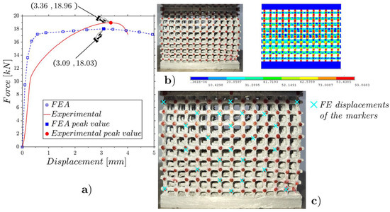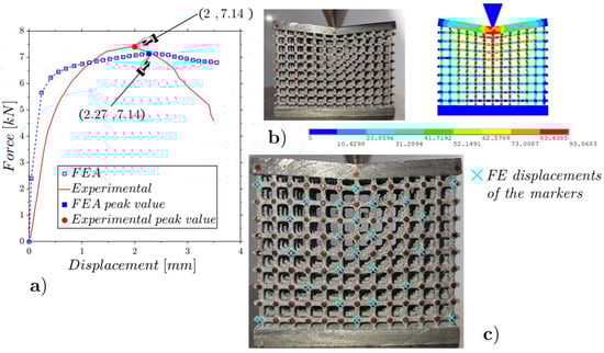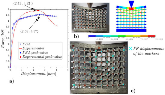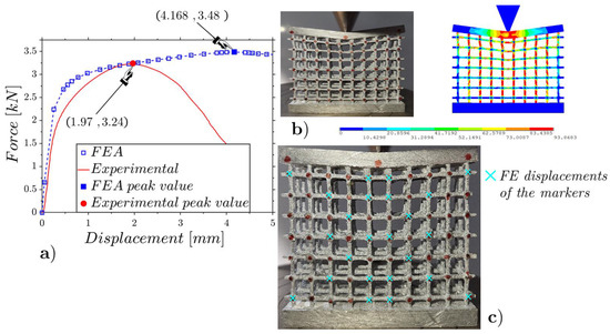 Flat static compression of the high-density lattice (Figure 3c): experimental and FE force–displacement responses (a); experimental and FE configurations at the incipient collapse (b); comparison of the experimental and FE marker displacements (c).