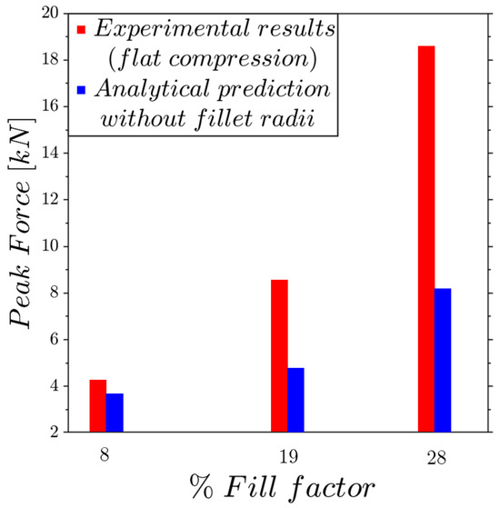 Previous tests have demonstrated the high structural strength exhibited by these structures. Therefore, it was fundamental to investigate the effect of the fillet shape on the mechanical strength. A simple and effective approach to achieve this was by an analytical estimation of the maximum theoretical force that a structure could support before collapse. Consider the lattice without the presence of the fillet radii; if it is cut by a horizontal plane, the vertical rods will support the load; hence, the maximum force is simply determined by multiplying the tensile ultimate strength of 93 MPa by the sum of the areas of the cut rods. In Figure 16, the peak forces measured by the experiments are compared with the theoretical peak values. The results are interesting and show that the experimental trend tends to improve as the filling increases more than theoretically expected.