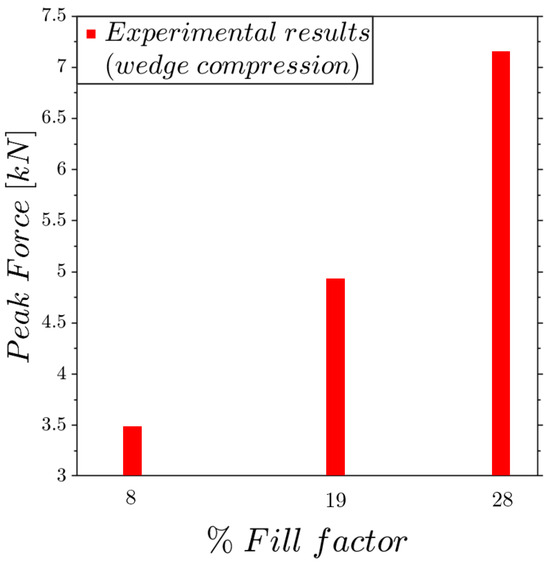 Experimental dimensionless peak force trends under wedge compression as a function of the fill factor.
