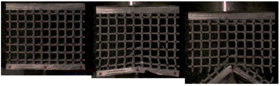 It is evident in Figure 14b and Figure 15b that curvatures occur in the images at the boundaries of the specimens. These curvatures, stemming from a perspective view, may potentially affect DIC analyses. Consequently, we selected the points where such visual distortions are absent. The RMSEs of the results for the internal displacements corresponding to Figure 14c and Figure 15c were 0.55 mm and 0.87 mm, which correspond to 26.30% of the peak displacements for the mean-density lattice and 28.16% of the peak displacements for the high-density lattice. These percentual results are just over double that obtained previously for the low-density lattice. This was due to the fracturing of some rods that occurred during the tests, which was not foreseen in the FE model.