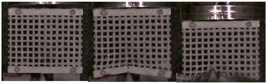 It was more interesting to investigate what happened when the impact involved a high concentrated load. Figure 22, Figure 23 and Figure 24 show the sequence frames for the wedge compression impact tests on the low-, mean- and high-density specimens, respectively. In all three cases, at the first impact stage, the central lattice regions deformed and absorbed the kinetic energy of the falling mallet; in the subsequent phases, the structures collapsed, leading to progressive and unstable fragmentation involving the entire lattices.