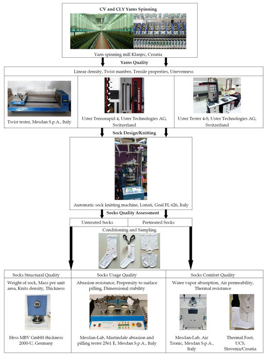 In this study, the quality of the socks was evaluated by assessing their structural, usage, and comfort quality before and after five consecutive laboratory simulations of household laundry (pretreatment) in accordance with the previously published sock evaluation methodology [8].