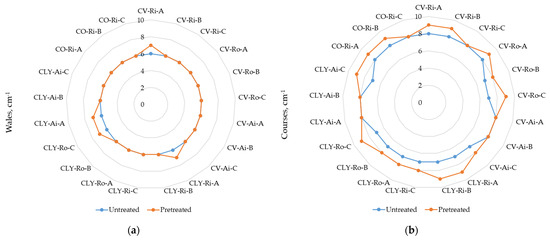 Results of the measured values of: (a) wale and (b) course density of untreated and wet pretreated sock plain knits (CV–viscose, CLY–lyocell, CO–cotton; Ri–ring spun, Ro–open-end rotor, Ai–air-jet spun; A, B, and C–sock series).