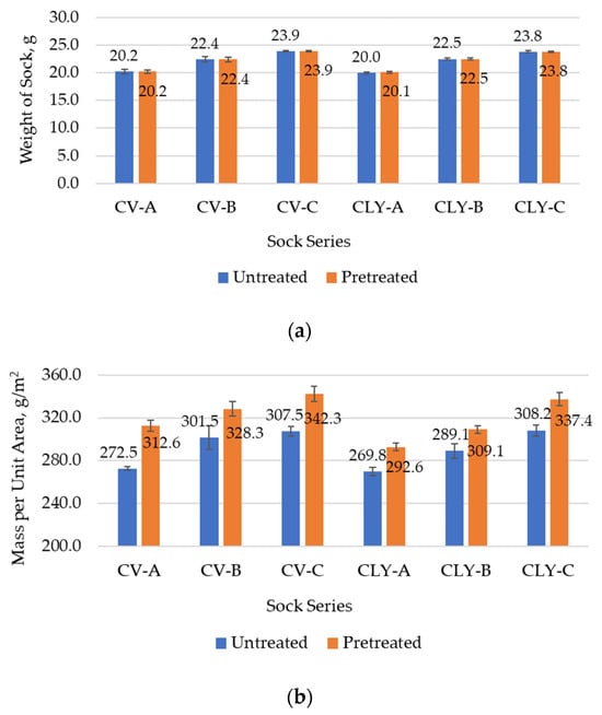 The measured values for the weight of the socks, the socks’ plain knit mass, the thickness, and the wale and course density, which were determined before (untreated socks) and after the five consecutive household washes and dryings of the socks (pretreated socks), are presented in Table 4 and Figure 5a,b. Figure 6 shows the average values of the structural properties that were determined for each sock series (A–C) produced from viscose or lyocell fibers.