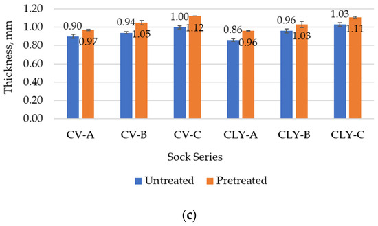 According to the results shown in Table 4 and Figure 6c, the thickness of the untreated socks varied only slightly. Nevertheless, somewhat higher average thickness values were determined in sock series A, produced with differently spun viscose yarns (Figure 6c), than for the same sock series produced with lyocell fibers (0.90 mm and 0.86 mm). This can be explained by the higher sock thickness values obtained for the CV-Ro-A and CV-Ai-A samples (0.90 mm and 0.93 mm, respectively), which were produced with open-end Ro- and Ai-spun viscose yarns of greater non-uniformity.
