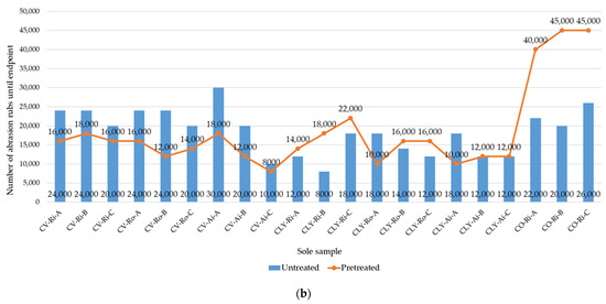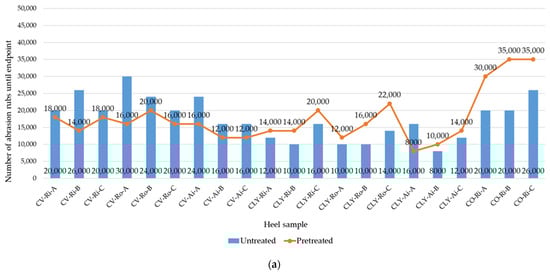 Socks must meet the requirements for high wear resistance [9,21]. The values of the abrasion rubs at the endpoint of the socks, measured on the heels and soles before (untreated socks) and after the five consecutive household washes and dryings (pretreated socks) using the Martindale abrasion test, are presented in Figure 7a,b.
