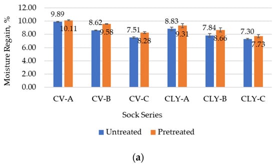 After the wet pretreatment, hydrophilicity increased due to full relaxation of all socks (Table 8). The moisture regain of the pretreated socks increased by 15% for the viscose socks, 13% for the lyocell socks, and 20% for the conventional cotton socks. The highest increase was observed in the sock samples of series B (Table 8 and Figure 8a), which had a better ability to absorb moisture.