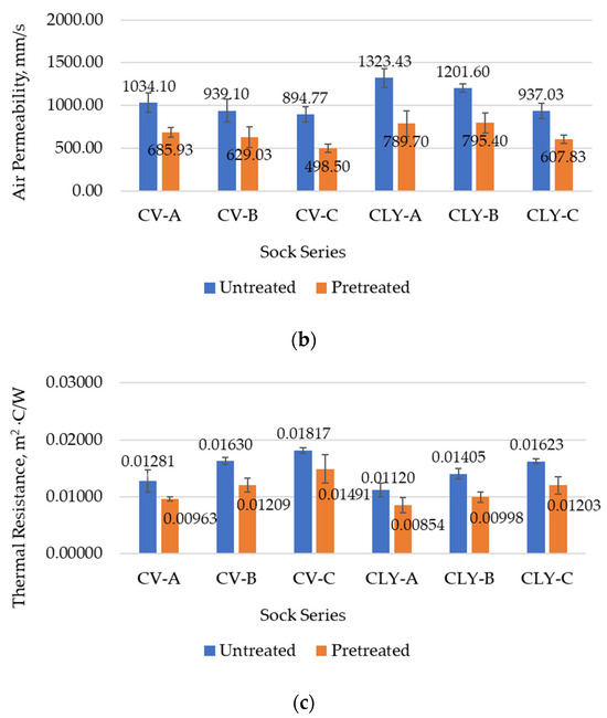 Average values of (a) moisture regain and (b) air permeability of sock plain knits; (c) thermal resistance of socks determined for each sock series (A–C) produced from viscose (CV) or lyocell (CLY) fibers before and after wet pretreatment, with the corresponding standard deviation.