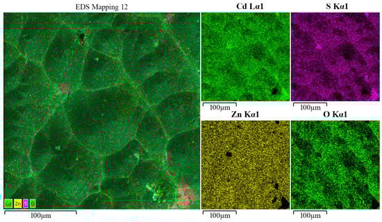 Energy-dispersive X-ray (EDX) analysis of the CdS films was conducted using a mapping technique. The EDX analysis was performed at an accelerating voltage of 20 kV to optimize the resolution and sensitivity for the elemental mapping of Cd, S, Zn, and O on the sample surface. This mapping allowed for a detailed study of the chemical composition of the film in different areas (Figure 4). Based on the data obtained, it is evident that the elements Cd and S are uniformly distributed across the surface.