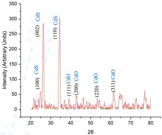 In the X-ray diffraction (XRD) analysis of the CdO/CdS/ZnO heterostructure, observed peaks present a complete picture of the material’s crystalline structure, with several peaks associated with different compounds in the heterostructure (Figure 6). Notably, the peaks at 24.85° and 26.30° correspond well with the (100) and (002) planes of hexagonal CdS (JCPDS Code: 41-1049), respectively, indicating a significant presence of this phase with high crystallinity. The peak at 34.45°, slightly shifted from the typical position for the (110) plane of hexagonal CdS, suggests some lattice distortion, potentially due to interaction with other phases in the heterostructure.