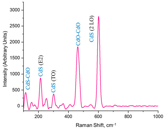 Lower intensity peaks at 115 cm−1 and 303 cm−1 also provide valuable information. The peak at 115 cm−1 could be associated with second-order combination scattering or multiphonon processes in CdO–CdS. Such low-frequency modes often indicate lattice defects in the crystalline structure. Meanwhile, the peak at 303 cm−1 could correspond to the TO phonon mode of CdS or a second-order phonon process in CdO. The lower intensity of this peak compared to the LO mode is typical due to the generally weaker Raman activity of TO modes in these materials [77].