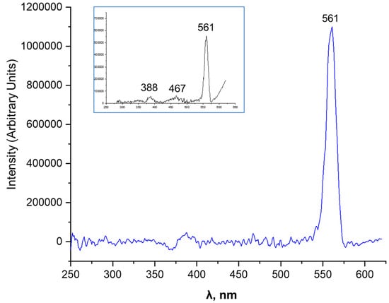 The photoluminescence (PL) spectrum of the CdO/CdS/ZnO heterostructure exhibits a prominently expressed peak at 561 nm, falling into the green–yellow region of the visible spectrum, accompanied by a notably narrow full width at half maximum (FWHM) of 13.52449 nm (Figure 8). This narrow FWHM indicates a uniform distribution of luminescent centers, implying high crystalline quality in the heterostructure.