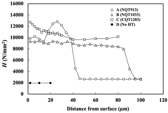 High wear resistance is essential for enhancing the durability of materials used in mechanical structural parts. Increasing the hardness (H) of the friction surface considerably improves wear resistance [1]. Various coating materials and their processes have been developed to increase surface hardness [2,3,4,5,6,7,8,9,10]. In particular, the carburising–quenching–tempering (CQT) process [11,12,13], which involves heating above 1123 K in an acetylene gas atmosphere to facilitate carbon atom diffusion into steel, has been widely industrialised. Additionally, the industrial application of the nitriding–quenching–tempering (NQT) process, which involves heating to 893–1103 K in an ammonia gas atmosphere to promote nitrogen atom diffusion into the steel followed by quenching–tempering, is continuously expanding [14,15]. The thermal strain in the NQT-treated parts is lower than that in the CQT-treated parts owing to the lower heating temperature [16].
