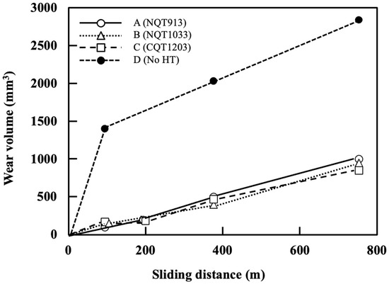 Relationships between the wear volume and sliding distance established for the specimens fabricated by nitriding, quenching from 913 K, and tempering (A); nitriding, quenching from 1033 K, and tempering (B); CQT (C); and without heat treatment (D) [24,25].