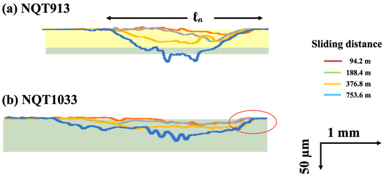 To analyse the wear behaviour of the iron specimens more comprehensively, the left portions of the depth profiles of the wear scars obtained in Figure 8 are taken for NQT913 and NQT1033 by adjusting the scales of the X-axis and Y-axis. The obtained results presented in Figure 9 led to the following conclusions.
