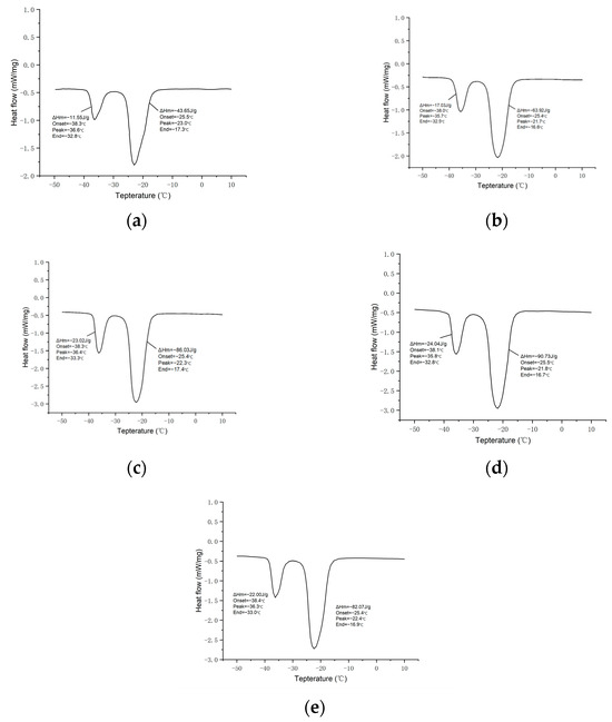 DSC images of n-undecanone microcapsule phase change cold storage materials prepared with different SMA dosages: (a) 1%; (b) 3%; (c) 5%; (d) 7%; and (e) 9%.