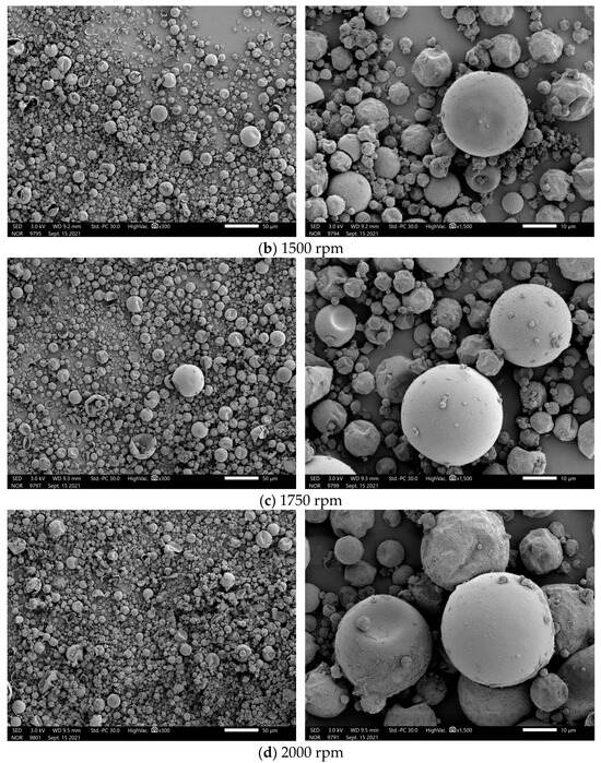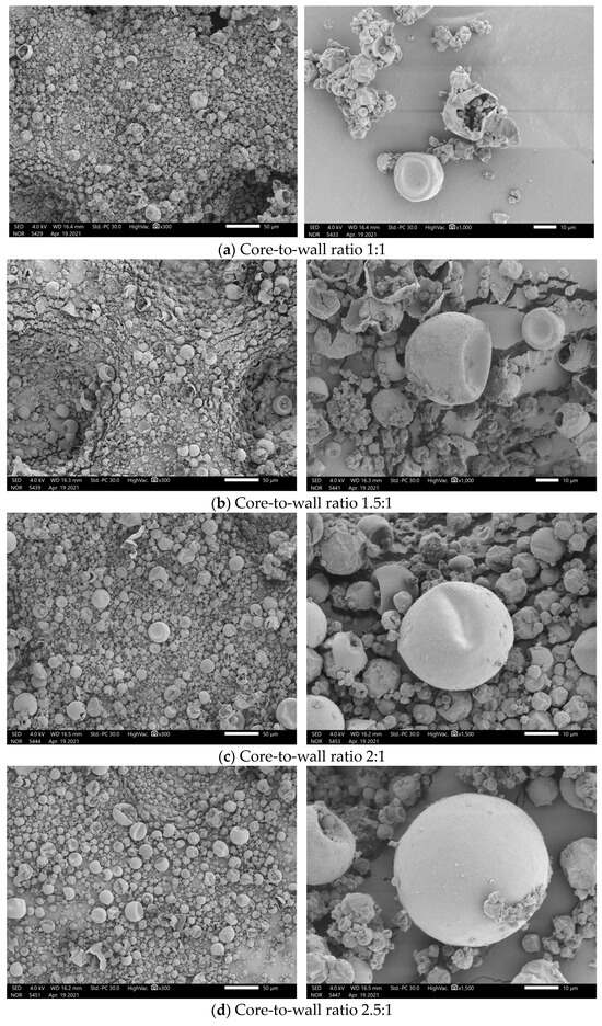 As the emulsification speed was increased to 1500 and 1750 rpm, as shown in Figure 8b,c, it can be observed that the number of intact microcapsules increased, and the surface was smoother, suggesting that the emulsion dispersed more uniformly during emulsification after increasing the emulsification speed. Under the same scale, it can also be found that the particle size of the microcapsules becomes smaller, and the particle size tends to be consistent.