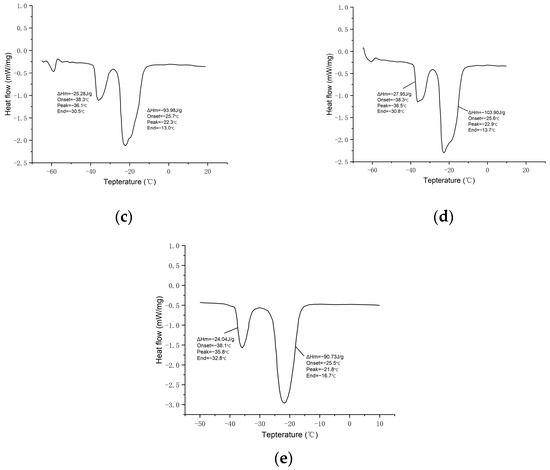 Figure 5 shows DSC diagrams of n-undecane microcapsule phase change materials prepared with different SMA dosages. The DSC results suggest two phase change peaks, one at approximately −22 °C and another at −36 °C. The enthalpy of the peak at −22 °C is significantly greater than the other, making it the primary energy storage temperature. Since the phase transition temperature of −22 °C aligns with the requirements for freezing and cooling storage, it can serve as the reference for calculating the enthalpy of phase transition in the n-undecane microcapsules.