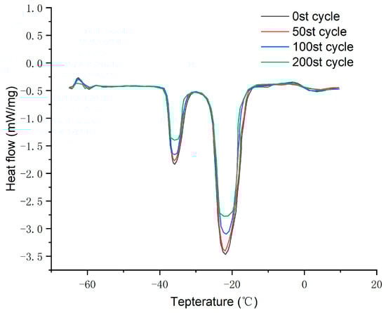 A certain amount of eicosane-based microencapsulated phase change material (MEPCM) was subjected to 50, 100, and 200 cold/hot cycles: each cycle involved heating at 20 °C for 10 min, followed by cooling at −50 °C for 10 min. Figure 12 displays the DSC curves of eicosane after three different numbers of cold/hot cycles, with specific thermal performance parameters listed in Table 9. The latent heat of fusion for MEPCM was 120.3 kJ/kg before undergoing any cold/hot cycles. These values decreased to 118.5 J/g after 50 cycles, 109.4 kJ/kg after 100 cycles, and further to 101.7 kJ/kg after 200 cycles. Compared to the material before any cycles, the enthalpy value decreased by 1.8 kJ/kg after 50 cycles, corresponding to a 1.2% reduction in encapsulation efficiency. After 100 cycles, the enthalpy value dropped by 10.9 kJ/kg, with a 7.6% decrease in encapsulation efficiency. Following 200 cycles, the enthalpy value decreased by 18.6 kJ/kg, and the encapsulation efficiency dropped by 12.9%. The data indicates that after 200 cycles, the encapsulation efficiency of MEPCM remains relatively stable, demonstrating its good thermal stability and cycle stability. Even after multiple thermal cycles, MEPCM can maintain a stable latent heat of fusion, indicating excellent thermal performance and cycle life of the phase change material. This underscores the crucial importance of the high reliability and stability of MEPCM in practical applications.