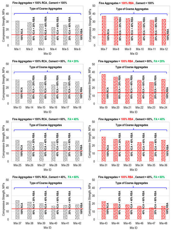 - The compressive strength of hybrid recycled aggregate concrete is greatly affected by the proportion of coarse recycled brick and concrete aggregates. The least compressive strength was achieved when 60% of coarse RBAs were used, along with 40% of coarse RCAs.