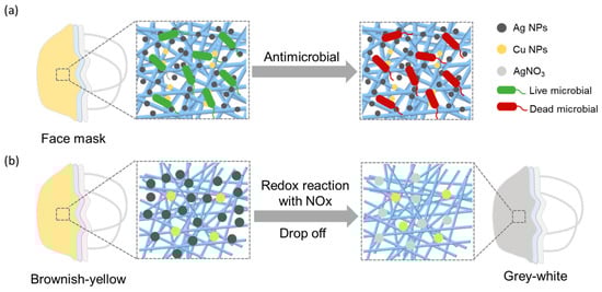 Ag–Cu NPs not only exhibit excellent antimicrobial effects but also demonstrate excellent responsiveness to oxidative gases such as NOx. As depicted in Figure 1a, Ag NPs attach to bacterial cell walls and membranes, followed by their penetration into the microbial interior. Inside, they disrupt intracellular structures such as mitochondria, vacuoles, and ribosomes, as well as biomolecules including proteins, lipids, and DNA. Additionally, they induce cell toxicity and oxidative stress through the generation of reactive oxygen species and free radicals, ultimately resulting in microbial inactivation [27]. Furthermore, Cu NPs can induce oxidative stress, leading to the disintegration of viral or bacterial membranes, interfering with viral activity, and enhancing the production of toxic compounds against microorganisms, ultimately achieving antimicrobial effects [28]. As shown in Figure 1b, under the action of Ag NPs, NOx is oxidized to NO2−/NO3−, ultimately resulting in the formation of AgNO3 [29,30]. This reaction leads to the oxidation and detachment of Ag on the surface of the mask, ultimately causing a noticeable change in the mask’s color. By applying Ag–Cu NPs to masks, not only excellent antibacterial properties are imparted, but also respiratory monitoring functionality is achieved.