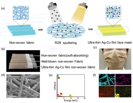 (a) Preparation process flowchart of ultra-thin Ag–Cu film face mask; (b) Optical photograph of the three-layer structure of the ultra-thin Ag–Cu film face mask; (c) Optical photograph of the ultra-thin Ag–Cu film face mask during actual wearing; (d) SEM images of the ultra-thin Ag–Cu film face masks; (e) Point-scanning EDS spectrum of the ultra-thin Ag–Cu film face masks; (f) Surface-scanning EDS spectroscopy of the ultra-thin Ag–Cu film face masks.