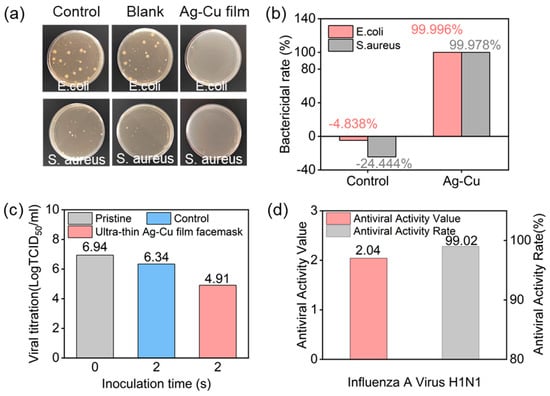 (a) Optical images of colony-forming unit plates for E.coli and S. aureus after 18 h of treatment using raw fabric, blank samples, and ultra-thin Ag–Cu film non-woven fabric; (b) Quantitative assessment of antibacterial properties based on E. coli and S. aureus survival rate; (c) The logarithmic values of the average virus titers for the control sample and ultra-thin Ag–Cu film face masks; (d) Antiviral activity values and antiviral activity rates of ultra-thin Ag–Cu film face masks against influenza A virus H1N1.