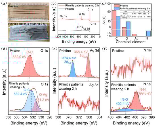 (a) The pristine ultra-thin Ag–Cu film face mask and the ultra-thin Ag–Cu film face mask worn by rhinitis patients for 2 h; (b) XPS survey spectra of the pristine ultra-thin Ag–Cu film face mask and the ultra-thin Ag–Cu film face mask worn by rhinitis patients for 2 h; (c) The atomic percentage of the pristine ultra-thin Ag–Cu film face mask and the ultra-thin Ag–Cu film face mask worn by rhinitis patients for 2 h; (d–f) Detailed spectra of the O 1s, Ag 3d and N 1s orbitals for the pristine ultra-thin Ag–Cu film face mask and the ultra-thin Ag–Cu film face mask worn by rhinitis patients for 2 h.