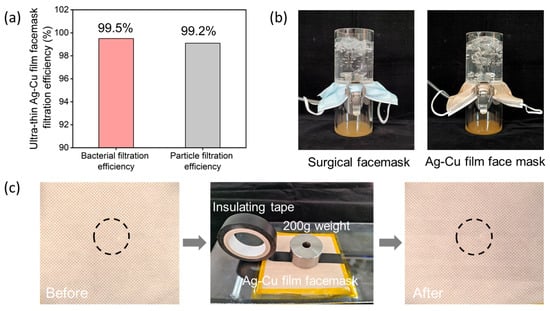 (a) Bacterial filtration efficiency and particle filtration efficiency of ultra-thin Ag–Cu film face masks. (b) Breathability testing of medical surgical face masks and ultra-thin Ag–Cu film face masks. (c) Adhesion testing of ultra-thin Ag–Cu film face masks.