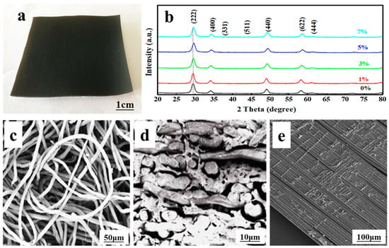 The photograph of the flexible composite is shown in Figure 1a, where it can be seen that the La-doped Sm2Zr2O7/PU has been coated onto the surface of the composite. It can be seen from Figure 1b that the addition of La has no significant effect on the structure of the Sm2Zr2O7 crystal. Compared with the standard XRD pattern, it can be seen that each curve in the figure corresponds to the cubic crystal system of Sm2Zr2O7 (JCPDS card No. 24-1012) with a pyrochlore structure. The size of Sm2Zr2O7 particles is estimated to be about 15 nm using Scherrer’s formula. However, with the partial substitution of Sm3+ ions by La3+ ions, the XRD pattern of La-doped Sm2Zr2O7 is slightly offset compared with pure Sm2Zr2O7. The diffraction peak near 29.4° shifts slightly toward a higher angle with the increase in La-doping amount. The results show that La3+ ions are partially substituted and enter the lattice position of Sm3+ ions, but the pyrochlore type (A2B2O7) structure remains. The slight deviation of the diffraction peak may be caused by the different ion radii of La3+ (1.063 Å) and Sm3+ (1.098 Å). Although La-doping does not change the crystal structure of the samples, the intensity of some diffraction peaks of the sample is slightly weakened, and the width is slightly increased after doping, indicating that the grain size of Sm2Zr2O7 is slightly decreased due to La entering the lattice. Figure 1c–e shows the microstructure of the composite material, indicating that La-doped Sm2Zr2O7/PU was well-immersed into the leather.