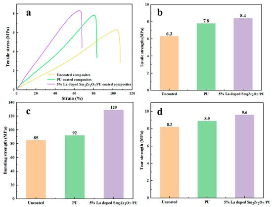 (a) Tensile stress–strain curves of different leather composites (uncoated composites, PU-coated composites, 5% La-doped Sm2Zr2O7/PU-coated composites); (b) tensile strength, (c) bursting strength, and (d) tear strength of different leather composites (uncoated composites, PU-coated composites, 5% La-doped Sm2Zr2O7/PU-coated composites).