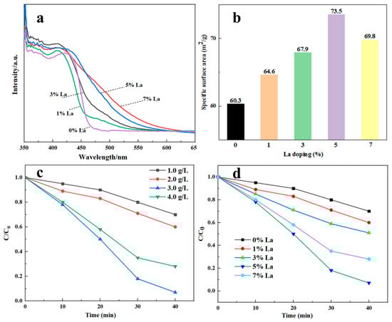 (a) UV-vis spectrometer of Sm2Zr2O7 with various doping contents of La; (b) specific surface area; (c) effect of Sm2Zr2O7 concentration on catalytic performance; (d) effects of La contents in Sm2Zr2O7 on Congo red degradation efficiency.