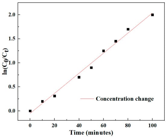 k is the apparent reaction rate constant, C0 is the initial concentration of Congo red, and C is the concentration of Congo red at the reaction time t. Figure 5 shows the relationship between the concentration changes of Congo red solution under different illumination times. It can be seen from the figure that the reaction conforms to the quasi-first-order reaction, and ln (C0/C) changes in a linear relationship with time.