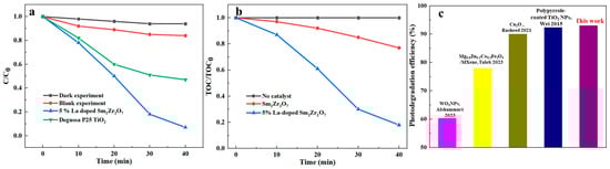 (a) The degradation rate (C/C0) of Congo red as a function of irradiation time (C0 and C represent the equilibrium concentration of Congo red before and after UV irradiation, respectively): a dark experiment (without irradiation); a blank experiment (in the absence of La-doped Sm2Zr2O7/PU); 5% La-doped Sm2Zr2O7/PU under irradiation; and Degussa P25 TiO2 under irradiation; (b) the TOC rate (TOC/TOC0) of Congo red as a function of irradiation time: a dark experiment (without irradiation); an experiment without a catalyst; Sm2Zr2O7/PU under irradiation; 5% La-doped Sm2Zr2O7/PU under irradiation; (c) the photocatalytic efficiency of 5% La-doped Sm2Zr2O7/PU on Congo red was compared with other reported photocatalysts [,,,].