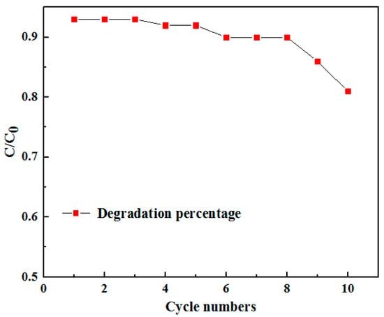 In addition to photocatalytic degradation activity, another important index to characterize photocatalysts is catalytic stability, especially for composite structure where component separation may occur. In order to evaluate the catalytic stability of the La-doped Sm2Zr2O7/PU composite emulsion, a cyclic stability test of the La-doped Sm2Zr2O7/PU composite was carried out during the photocatalytic degradation process. The analysis of experimental results is shown in Figure 7. As shown in Figure 7, the degradation rate of the La-doped Sm2Zr2O7/PU composite was almost unchanged after eight photocatalytic degradation cycles, indicating that the La-doped Sm2Zr2O7/PU composite had good cyclic stability. However, the catalytic degradation performance gradually decreased after more than eight cycles of cyclic testing. This can be attributed to the continuous adsorption of Congo red in the La-doped Sm2Zr2O7/PU composite coating failing to remove it in time, resulting in a gradual reduction in its photocatalytic degradation efficiency.