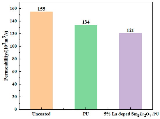 This leather material, used in the field of automotive interior or home decoration, needs to have good air permeability because air permeability allows moisture and gas to pass through, improving ride comfort, especially in hot weather or during long drives. The air permeability of leather after coating with 5%-La-doped Sm2Zr2O7/PU emulsion is shown in Figure 8. Compared with leather coated with pure PU emulsion, the air permeability of leather coated with emulsion is slightly decreased, which is mainly due to the formation of film on the leather surface during the coating process of the emulsion. La-doped Sm2Zr2O7 nanoparticles can permeate into the leather, resulting in a decrease in the permeability rate of the leather composites.
