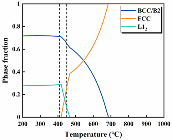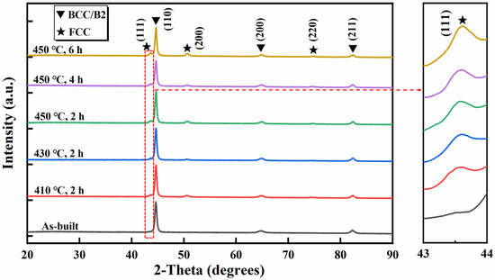 - Phase transformation occurred during the aging treatment, and a complex three-phase structure comprising BCC, B2, and FCC phases was achieved. With an increase in aging temperature and duration, an evident reduction in the content of the BCC/B2 phases was detected, accompanied by an increase in the FCC phases. It is obvious that the influence of the aging temperature on phase transformation is more significant than the aging time.