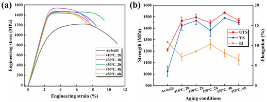 - Mei, X.Y.; Yan, Y.; Fu, H.D.; Gao, X.D.; Huang, S.Y.; Qiao, L.J. Effect of aging temperature on microstructure evolution and strengthening behavior of L-PBF 18Ni(300) maraging steel. Addit. Manuf. 2022, 58, 103071. [Google Scholar] [CrossRef]