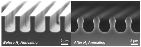 Cross-sectional SEM micrographs highlighting the rounding of the Si trench profile before and after being subject to 1100 °C H2 annealing.