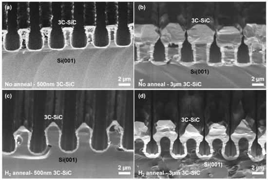 Cross-sectional SEM micrographs of 500 nm and 3 µm 3C-SiC heteroepitaxially grown on Si trench structures without annealing (a,b) and after 1100 °C H2 annealing (c,d).