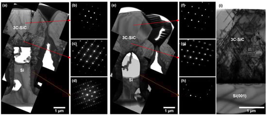 - Yamasaki, J.; Inamoto, S.; Nomura, Y.; Tamaki, H.; Tanaka, N. Atomic structure analysis of stacking faults and misfit dislocations at 3C-SiC/Si(0 0 1) interfaces by aberration-corrected transmission electron microscopy. J. Phys. D Appl. Phys. 2012, 45, 494002. [Google Scholar] [CrossRef]