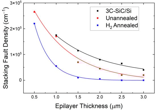 Defect densities can be reduced in 3C-SiC through the epitaxial growth of thicker films, due to the self-annihilation of planar defects; however, this increases epitaxy costs and often increases wafer bow. In addition, this method only reduces the defect density of the 3C-SiC at the surface and does not improve the crystallinity of the epilayer near the interface with the substrate.