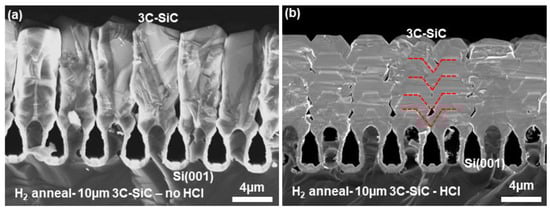 Cross-sectional SEM micrograph of 10 µm 3C-SiC grown on Si trench structures subject to 1100 °C H2 annealing without HCl (a) and with additional HCl (b) during epitaxy. The growth fronts of one column are highlighted in red to show the growth evolution.