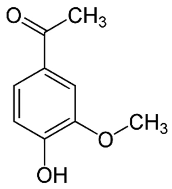 Apocynin (APO, 4-hydroxy-3-metoxyacetophenone, C9H10O3; Figure 1) is an interesting, naturally small molecule with antioxidant properties, classified as an acetophenone. Structurally, it resembles vanillin, hence it is often called acevanillione [].