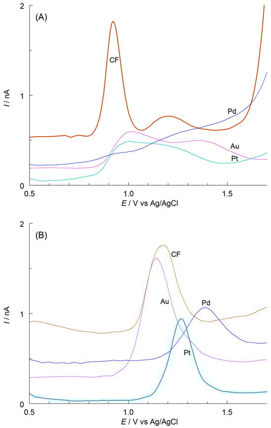 DPV curves of 0.50 mmol L−1 APO recorded in AcH with 20% AN (v/v) and 0.1 mol L−1 (A) CH3COONa or (B) NaClO4. The microelectrode disk material is given near the curves.