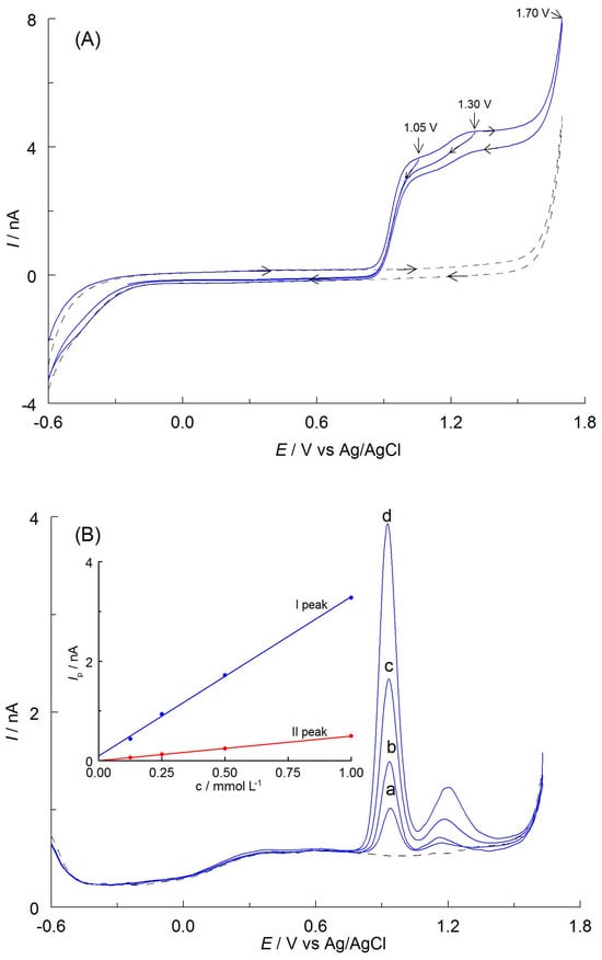 (A) LSV voltammograms (a scan rate of 6.2 mV s−1) of 0.50 mmol L−1APO recorded on CF microelectrode in AcH with 20% AN (v/v), 0.1 mol L−1 AcNa with different switching potentials, Eλ (given near the curves). The dashed line is the residual current. (B) DPV curves recorded in solutions containing APO with concentration of (a) 0.125, (b) 0.25, (c) 0.50, and (d) 1.0 mmol L−1. Inset: Calibration plot for DPV peak I and II.