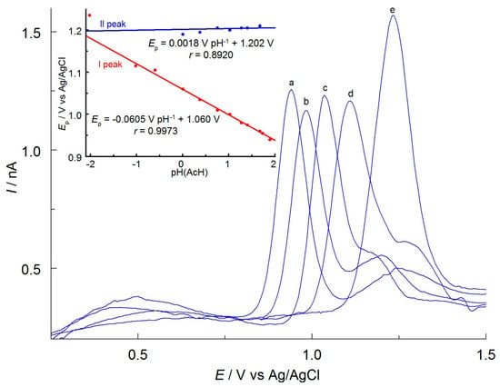 To investigate the contribution of protons to the electrode reaction, the effect of pH on the DPV curves’ peak potential was examined. Relative pH changes were obtained by altering the concentration of sodium acetate. Acetate anions are the strongest base in anhydrous acetic acid. Therefore, their increasing concentration increases the pH of the solution. To keep the ionic strength constant, the solutions also contained varying amounts of NaClO4. The total concentration of the supporting electrolyte was always 0.10 mol L−1. The abbreviation pH (AcH) was used for the relative changes in pH values measured in an acetic acid medium. Figure 4 shows that an increase in concentration of acetate ions and pH (AcH) causes the first peak, Ep, to shift toward less-positive potentials. The decrease in Ep with an increase in acetic anion concentration is due to the binding of protons, which are products of the first step of APO anodic oxidation. This shifts the equilibrium of the electrode reaction toward the products and thus facilitates the process. The position of the second signal is practically unchanged. Figure 4 inset shows a linear relationship between the potential of the first peak of APO oxidation on pH (AcH), with a slope of 0.0605 V pH−1. The value obtained is close to the expected theoretical value of 0.059 V pH−1 and indicates that the number of hydrogen ions and electrons involved in the first step of electrode reaction is equal. The potential of the second peak is practically independent of pH (AcH), which means that protons are not involved in the second step of APO anodic oxidation.