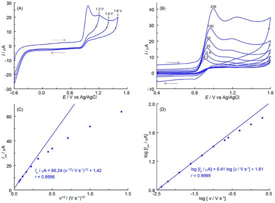 (A) Cyclic voltammograms (a scan rate of 100 mV s−1) of 1.0 mmol L−1 APO recorded on a GCE in AcH containing 20% AN (v/v) and 0.5 mol L−1 AcNa with different switching potentials Eλ (given near the curves). (B) CVs recorded in the scan rate range of 6.2–250 mV s−1. (C) The relationship between anodic peak current (Ipa) and the square root of the scan rate (v1/2). (D) The dependence of logarithm of Ipa vs. logarithm of v.