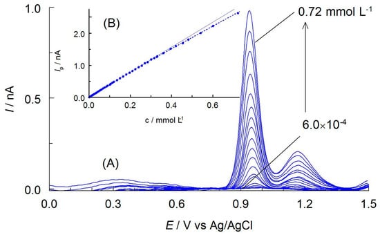 (A) DPV curves recorded on CF microelectrode containing different concentrations of APO ranging from 6.0 × 10−4 to 0.72 mmol L−1. Other components of the solutions are as shown in Figure 3. (B) Calibration plot for APO.