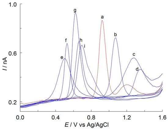 Selected DPV curves recorded on a CF microelectrode in solutions containing APO and possible interfering species (all at the concentration 0.25 mmol L−1): (a) APO, (b) α-lipoic acid, (c) BHT, (d) α-TOAc, (e) TBHQ, (f) α-tocopherol, (g) protocatechuic acid, (h) δ-tocopherol, (i) BHA. Other components of the solutions are as shown in Figure 3.